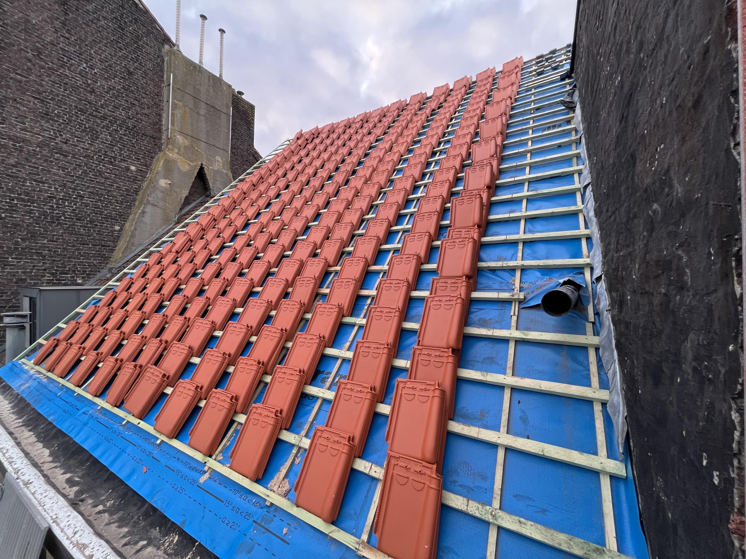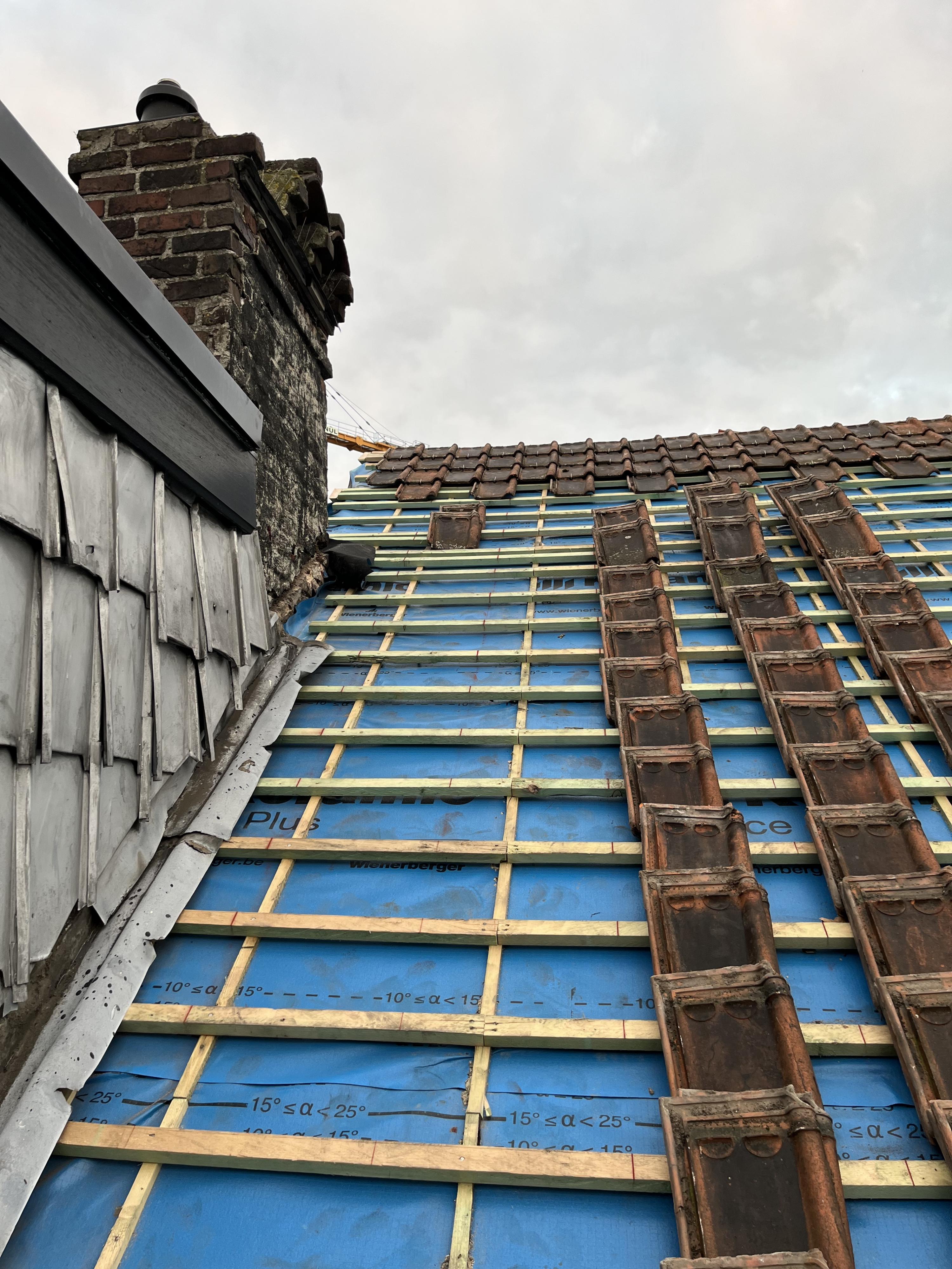 Verder werd berekend hoeveel pannen er in de breedte moeten gelegd worden en werden ze alvast klaargelegd tussen de pannelatten.