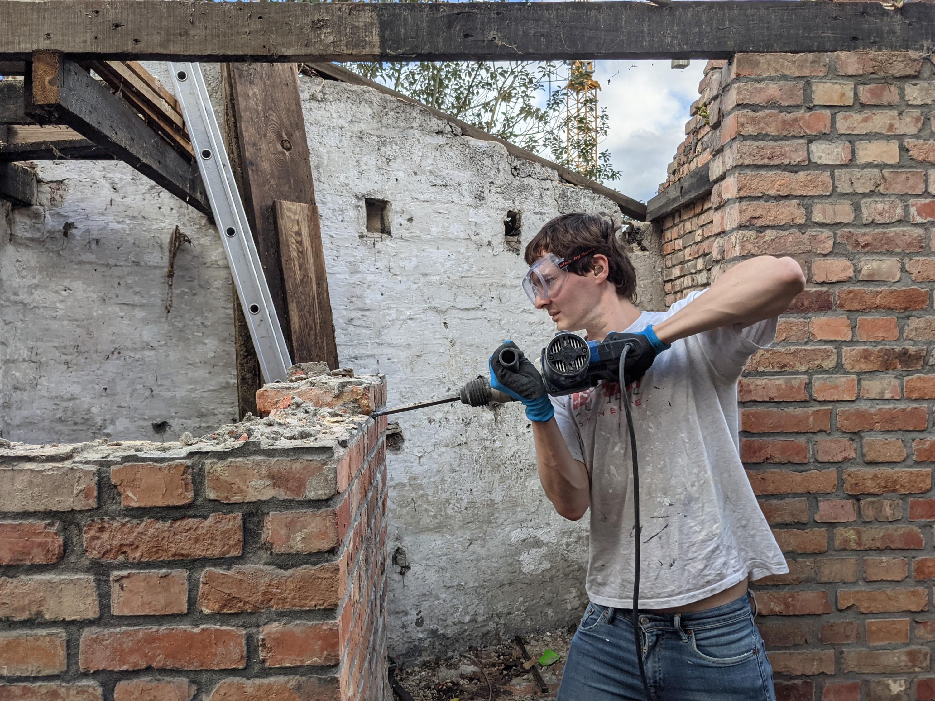 Daarna gingen we verder met de afbraak van het tuinhuis. De mortel is zo hard dat het een heel moeilijke opdracht blijkt. Gelukkig hebben we een "schieter" geleend, maar dan nog wordt het een werk van lange adem.