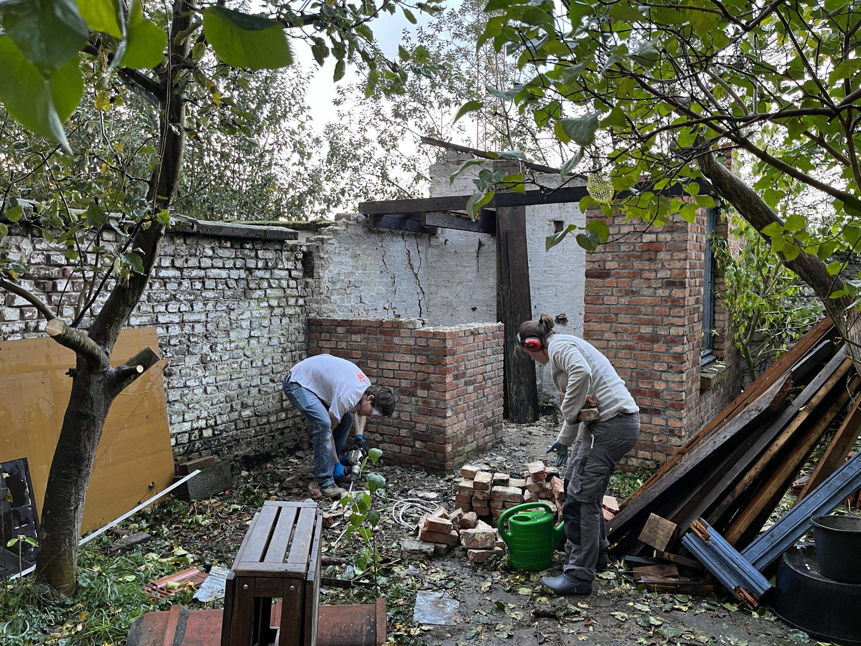 Intussen vulden we de kruipkelder in de voorplaats verder met steenpuin en kuisten we verder bakstenen van het tuinhuis voor hergebruik in de fietsenberging.