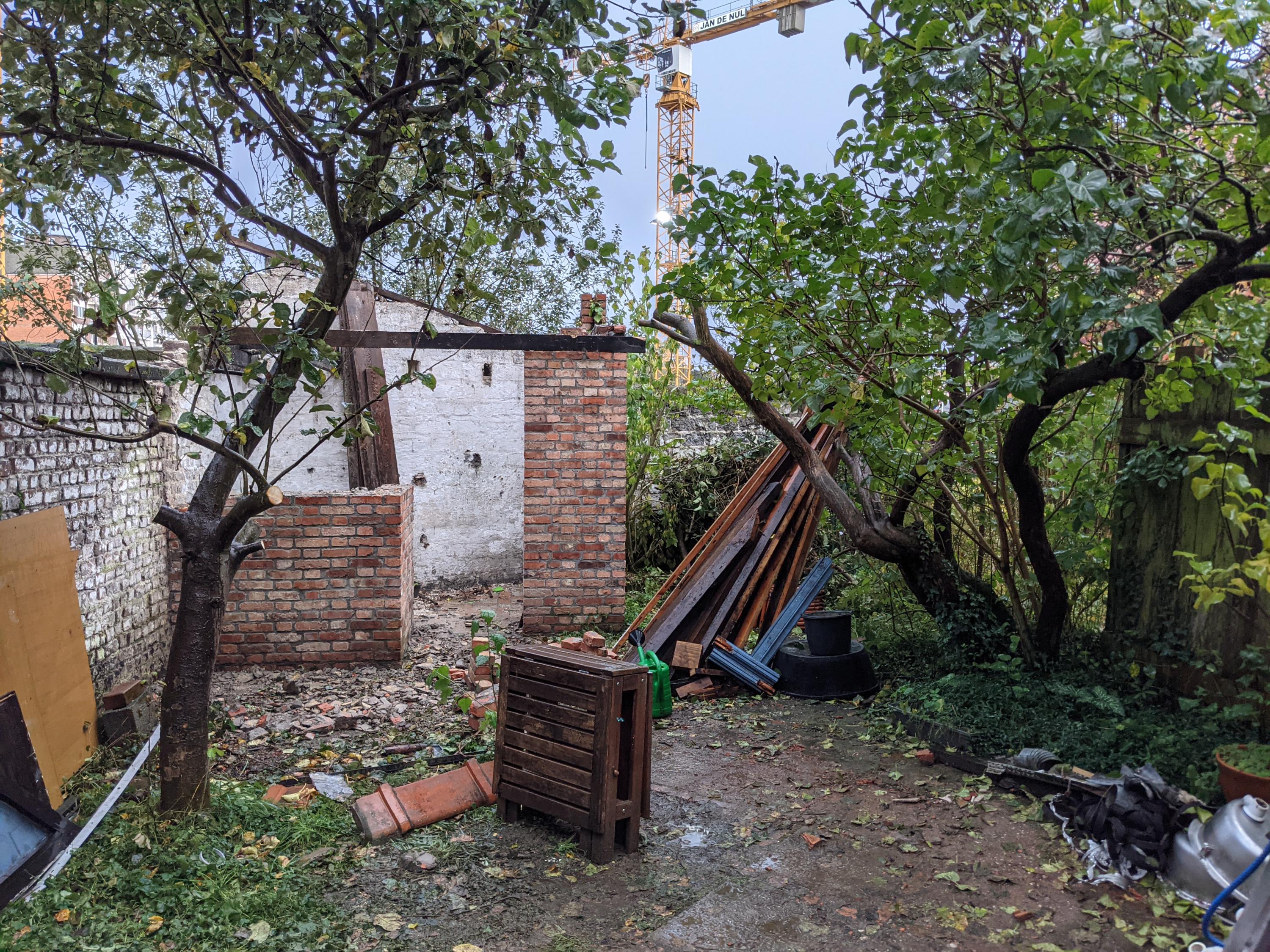De voorbije dagen werd de rest van de achterbouw afgebroken door de aannemer. Er resten nog enkel een paar stukjes muur en dan kan de vloerplaat en het terras beginnen uitgebroken worden.