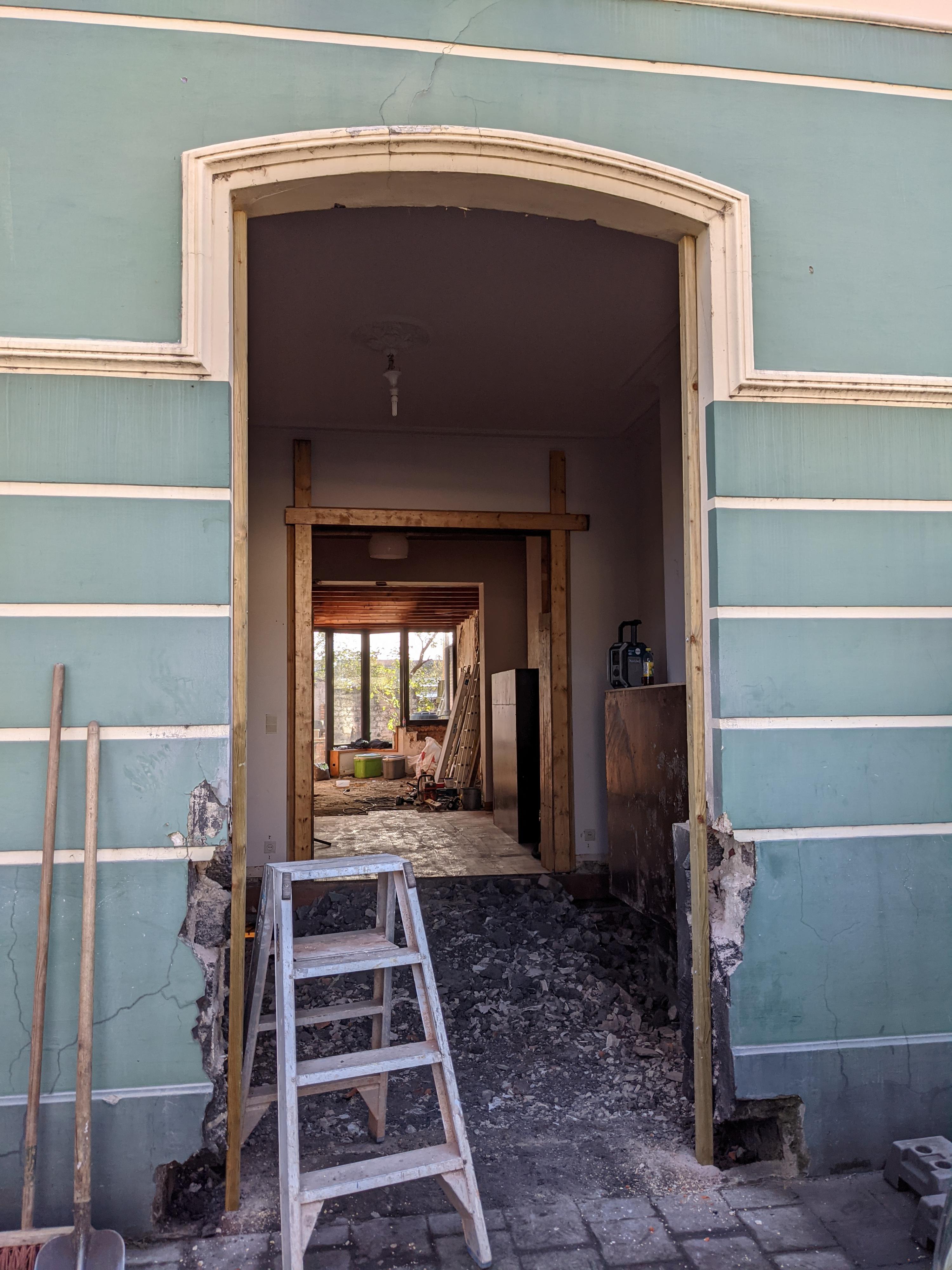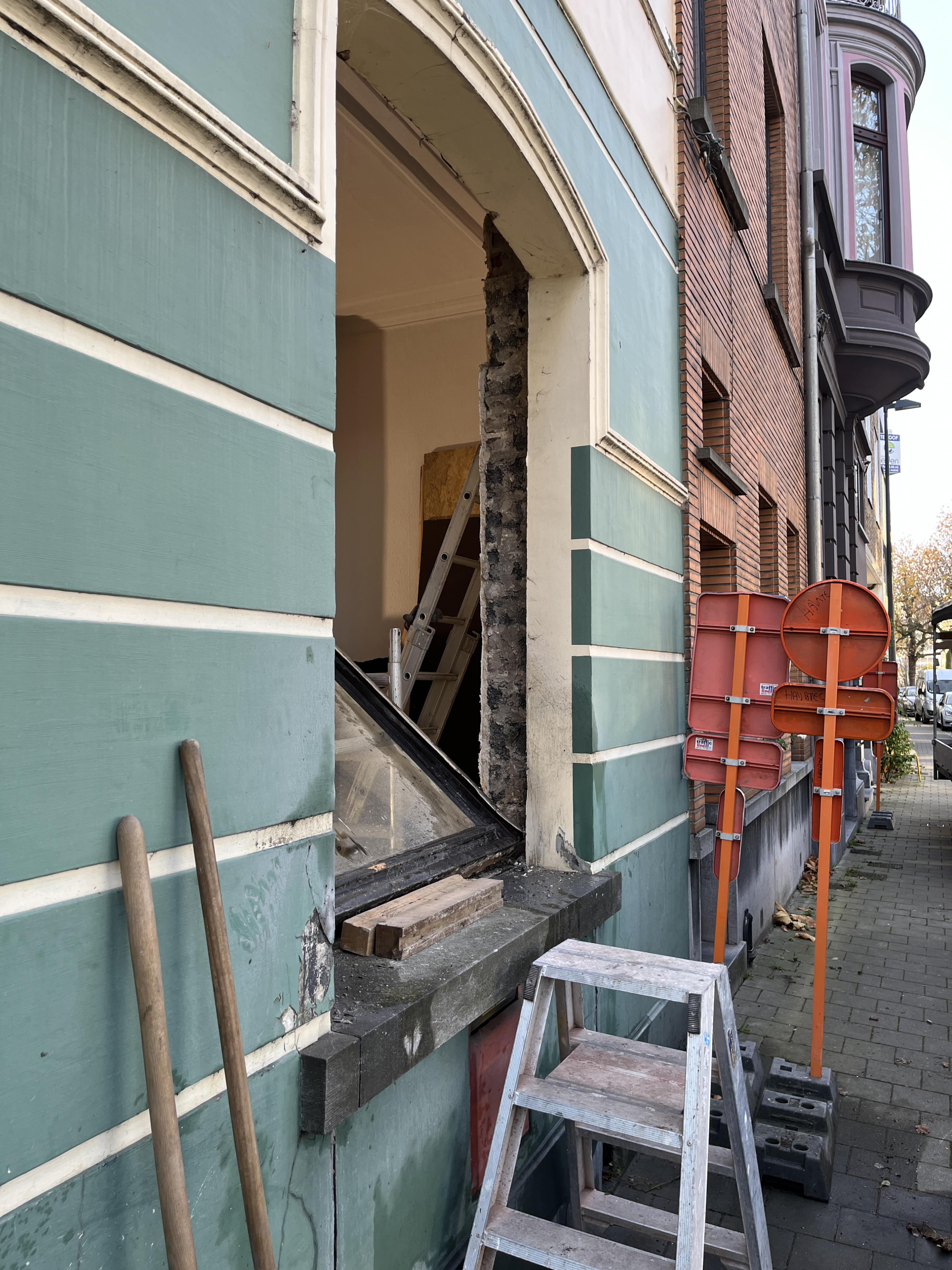 Vandaag is de aannemer van start gegaan voor het vervolg van de afbraak. Het raam in de voorgevel werd uitgebroken en er werd een opening gemaakt zodat ze met een kraantje binnen kunnen rijden.