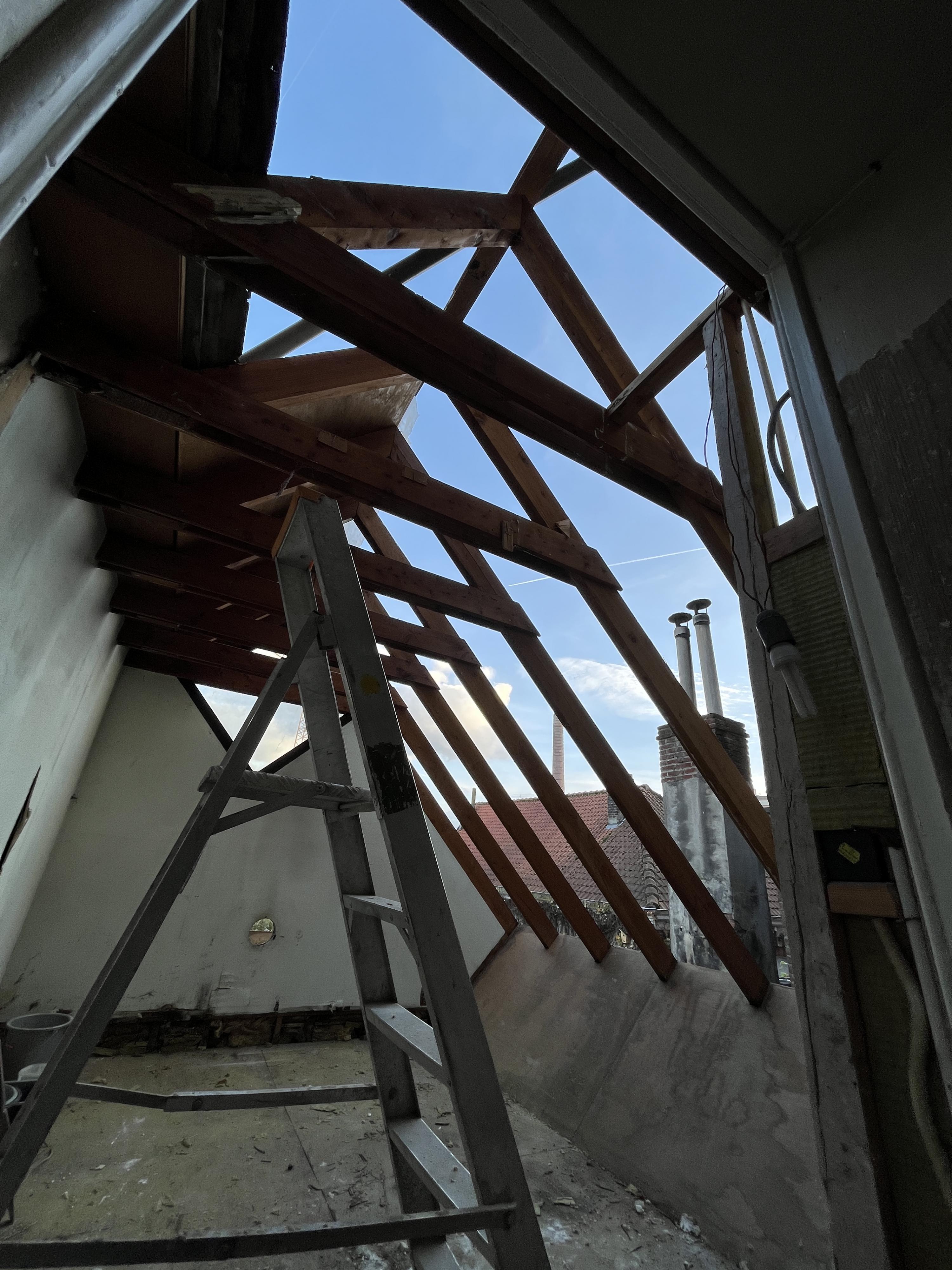 Er wordt zorgvuldig afgebroken zodat we de balken van de achterbouw zouden kunnen hergebruiken in de nieuwe fietsenberging.