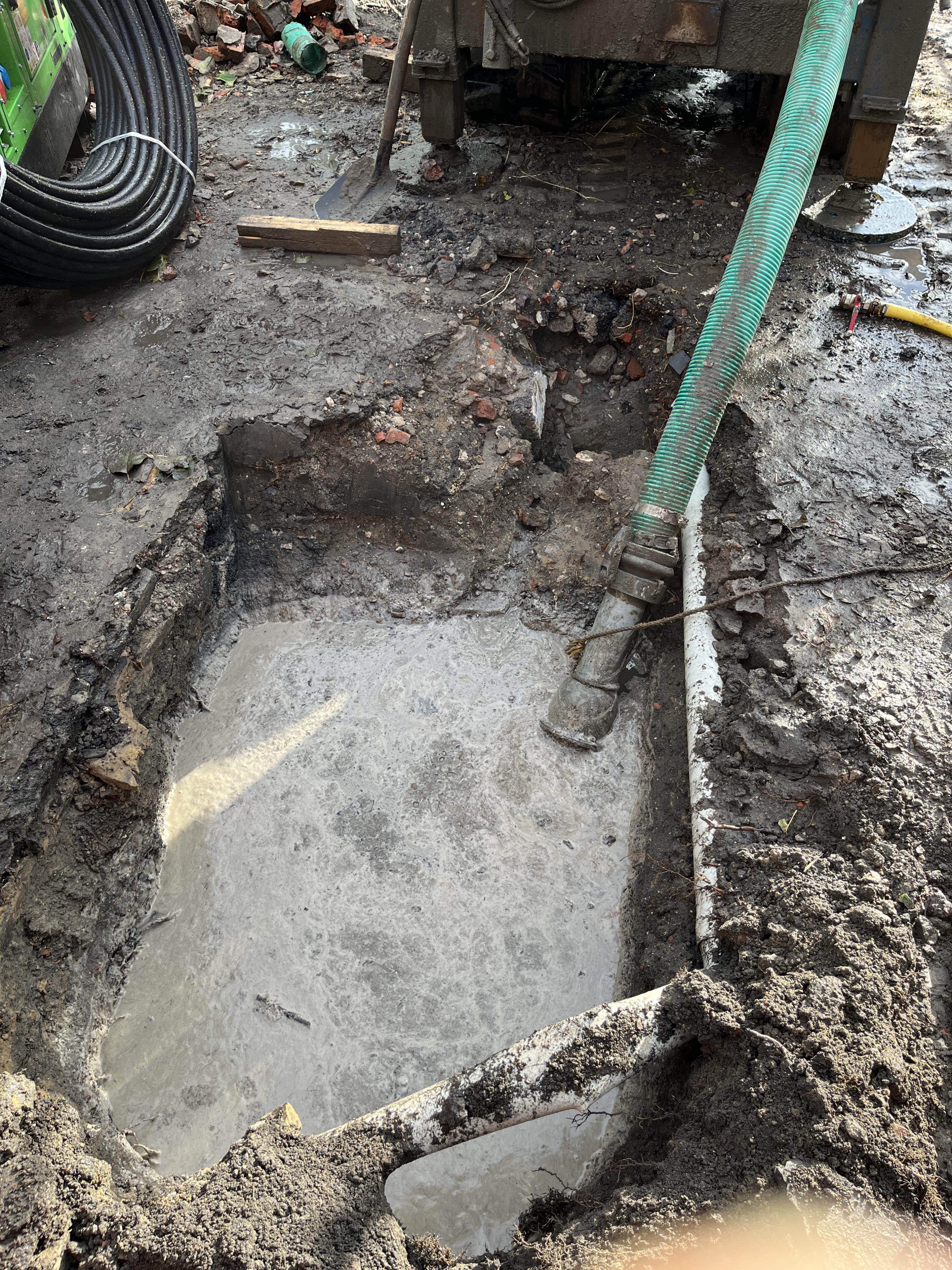 De eerste boring is eindelijk gelukt. Zelfs met de PVC-buis en de kleikorrels bleef er nog steeds heel veel spoelwater ontsnappen, dus het was weer een dagje nagelbijten en onze tuin is herschapen tot een modderpoel, maar stap 1 is toch al gelukt.